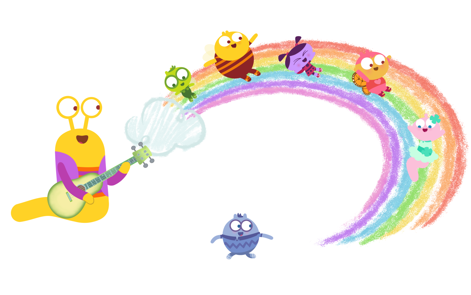 We’re so excited to welcome you to Ballybug's Shell School! Say hello to your favourite new classmates- Lu, Biba, Declan, Elodie, Barnaby, and Gus, and join this playful crew as they explore the wonderful ups and downs of preschool life—always with lots of fun and music!